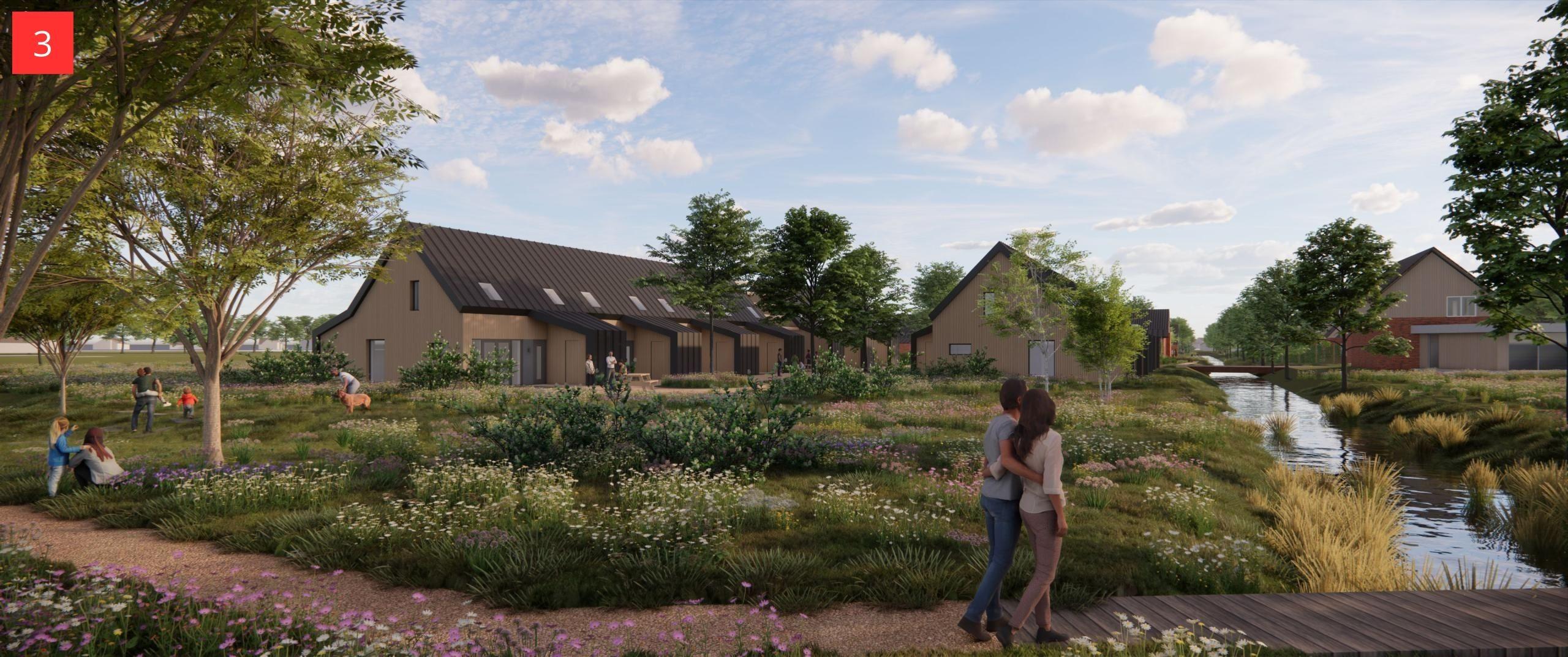 Een plek opgebouwd vanuit landschappelijke en historische waarde. De bestaande bomensingels zijn voor ons bepalend geweest voor de positionering van de woonvelden, terwijl de waterstructuren de natuurlijke begrenzingen vormen. Deze opzet creëert drie woonvelden die zich organisch voegen in de dorpse schaal van Vlagtwedde. Elk veld met zijn eigen identiteit.